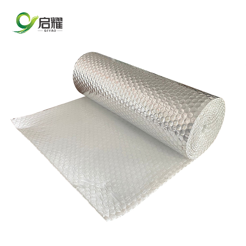 鋁箔氣泡膜兩側(cè)表面均為鋁箔.中間層為聚乙烯氣泡膜。其中間氣泡層可設(shè)置多層聚乙烯氣泡,層內(nèi)整齊列布?xì)馀?氣泡的直徑可供選擇范圍為5mm - 25mm,高度可選擇范圍為4mm - 10 mm.氣泡內(nèi)為空氣。